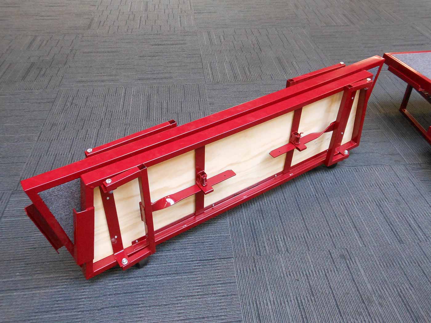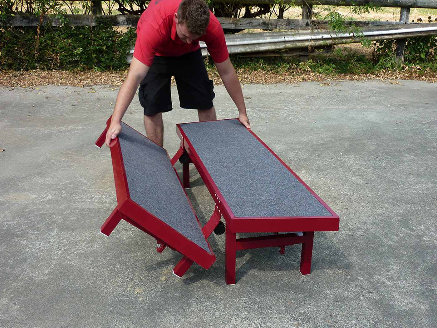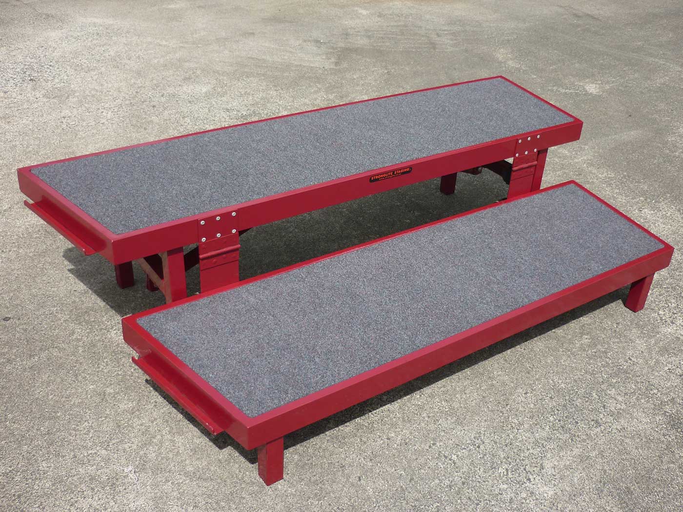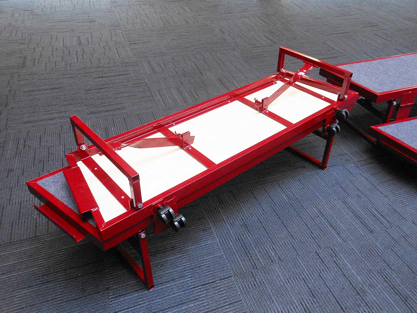 Powder-coated steel frame. One-piece ‘book-style’ folding system with castors allowing unit to be wheeled to position. Includes carpeted decks.